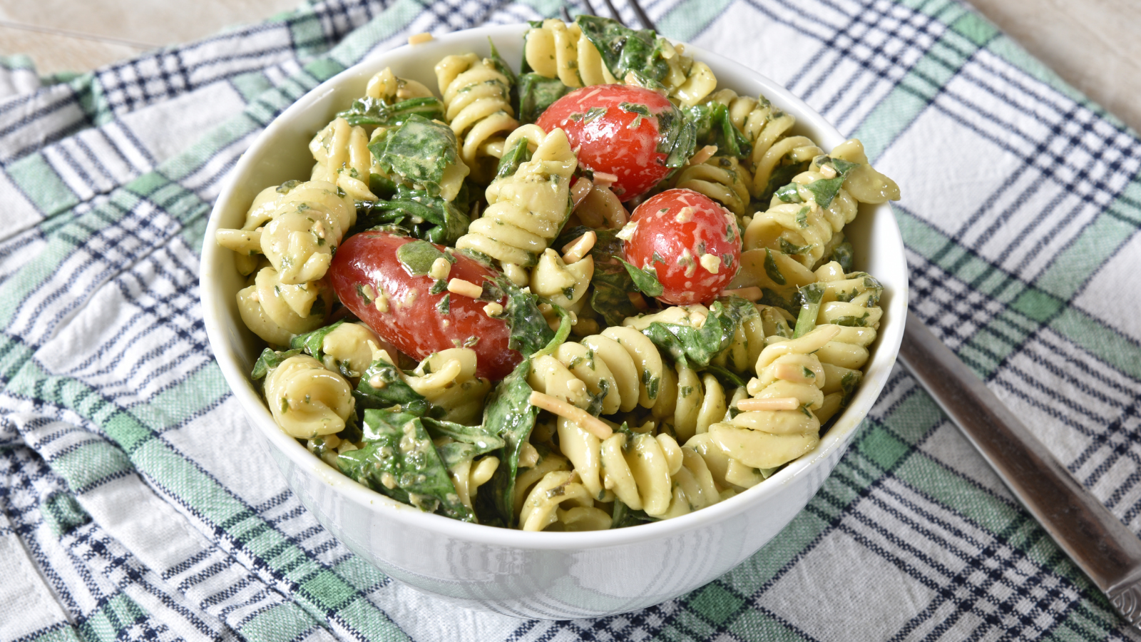When pasta has cooled, drain and toss pasta with herb dressing.
